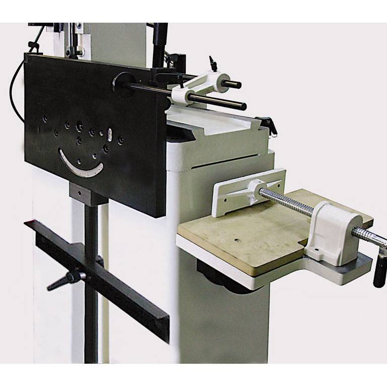 Важно, что конструкция со съемным столом совмещается с возможностью подачи сверлильно-долбежной части по осям. Крестообразные направляющие координатного механизма располагаются в основании колонны, подача производится при помощи рычагов. Для работы с серийными изделиями предусмотрены настраиваемые ограничители хода по осям и торцевой упор заготовки.