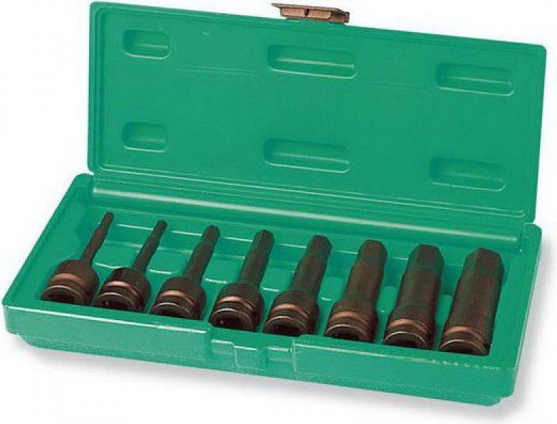 Набор головок предназначен для проведения ремонтных работ в сочетании с механическими приводами с крепежом, имеющим внутренний шестигранный рабочий профиль в диапазоне от 5 до 19 мм.