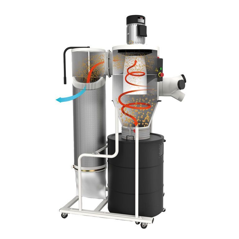 «Циклон» JCDC-3 обеспечивает постоянно высокую производительность. Его преимущества перед моделями с фильтром в виде мешка особенно заметны в сочетании с оборудованием для шлифовки, дающим много мелкой пыли. Гофрокартонный фильтр имеет большую (4,2 кв.м) площадь поверхности, оборудован рукояткой для стряхивания и очень долговечен. При работе со стружкой эффективность остается на высоком уровне – контейнер для крупной фракции имеет достаточный объем и очень легко извлекается/ устанавливается. Процедура проще, чем монтаж мешка с хомутом: «бак» на колесах подкатывается под крышку, после чего герметично ею накрывается; прижим производится одновременным движением двух рычагов. При утилизации крупной фракции мусора не приходится контактировать с мелкодисперсной взвесью, вредной для здоровья, пачкающей одежду, засоряющей мастерскую.