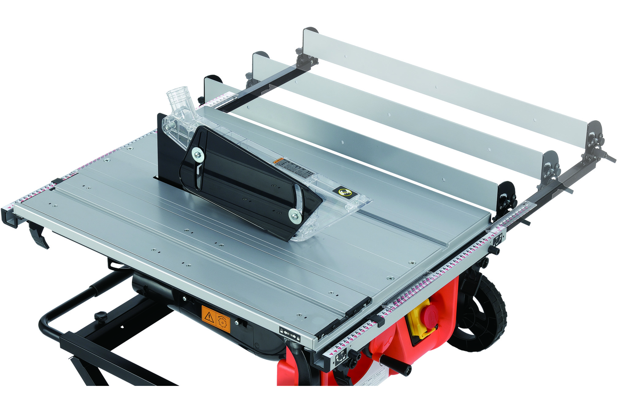 Рабочая поверхность может быть увеличена. Параллельный упор с поддерживающей полкой установлен на двух направляющих и может «выезжать» вбок на расстояние до 640 мм от левого края стола, выполняя функцию расширения.